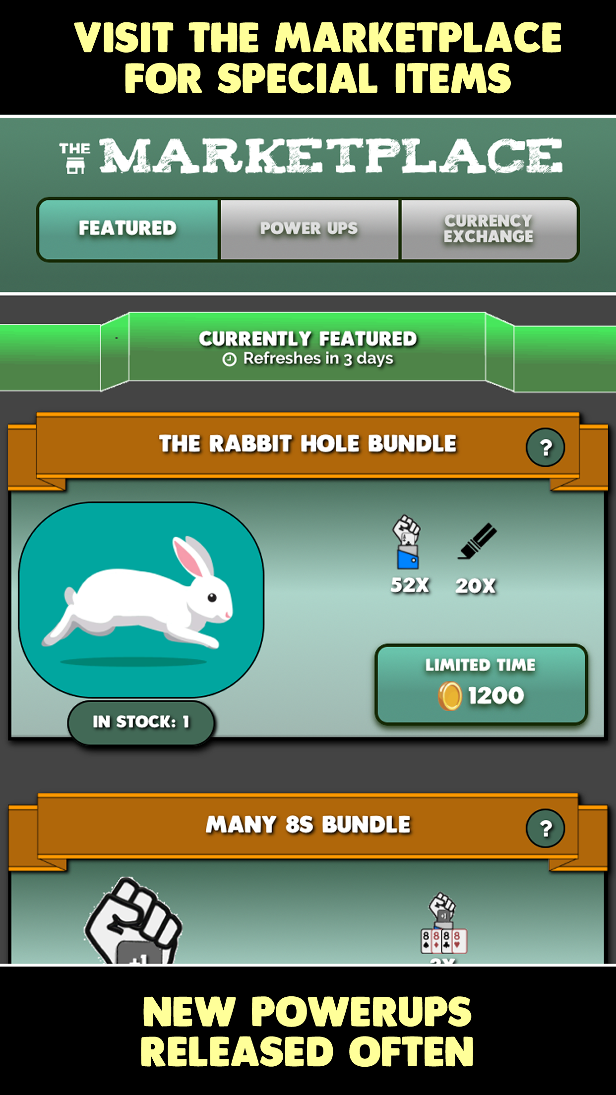 – MARKETPLACE for redeeming earned gold and poker chips for Special Power-Ups